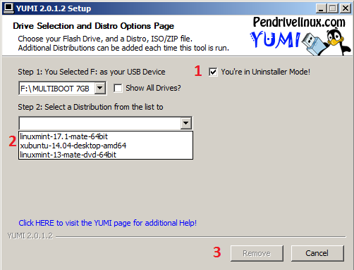 Também é possível remover qualquer distro instalada sem comprometer o funcionamento das outras. Para isto basta escolher o “Uninstaller Mode”, depois escolher a distro a ser removida e clicar em “Remove”.