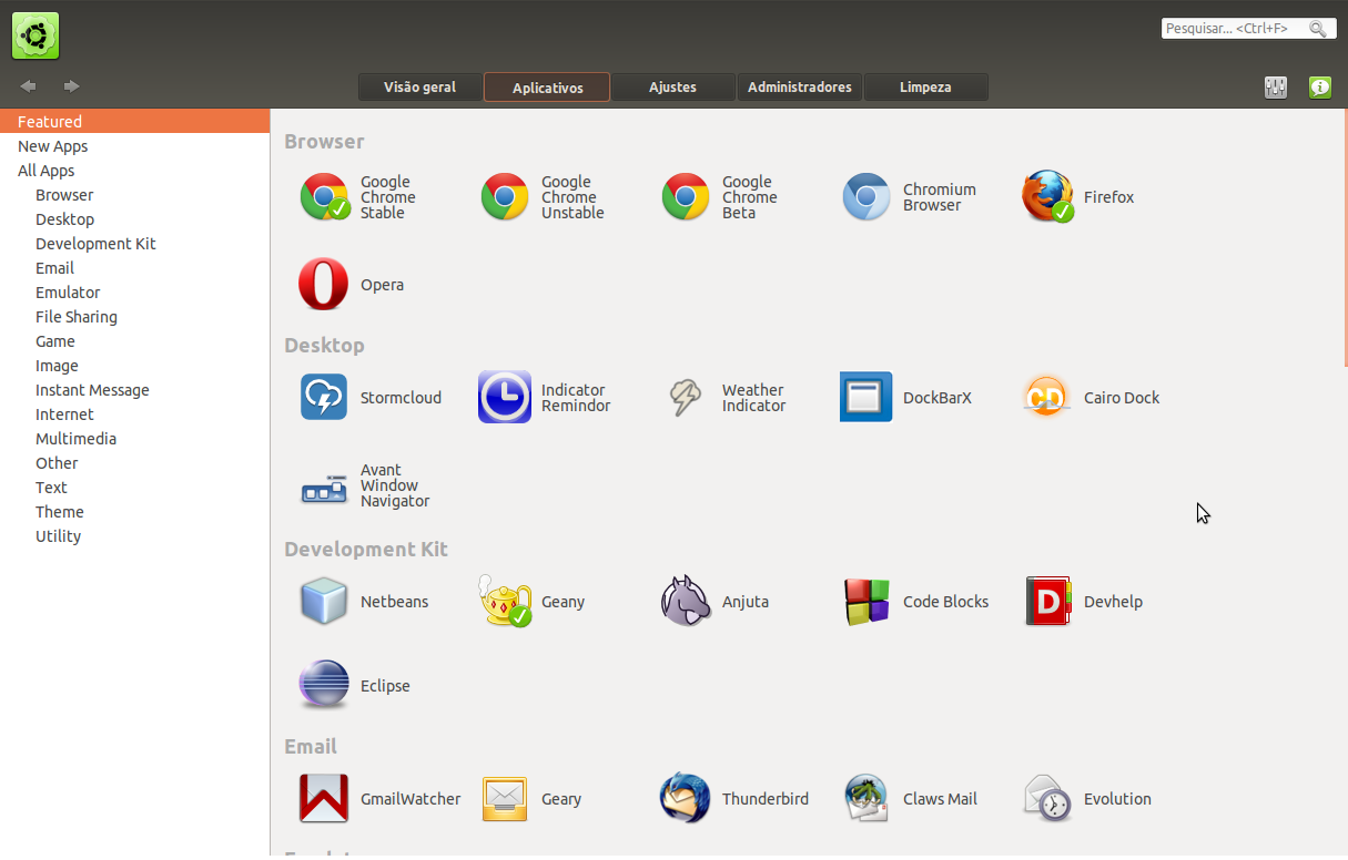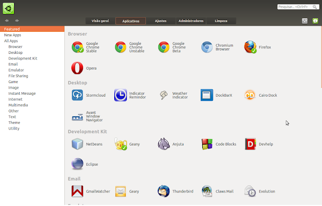 Abaixo temos a possibilidade de instalar em modo gráfico as versões mais recentes de alguns pacotes (programas) que estão em PPAs. Lembrando que o Ubuntu permite a instalação de pacotes através de PPAs (Personal Package Archives, que são pacotes criados por usuários) que muitas vezes nem estão disponíveis nos repositórios oficiais do Ubuntu. Podemos encontrar as mais recentes versões dos navegadores, players de vídeo, IDE’s de programação e diversos tipos de pacotes.