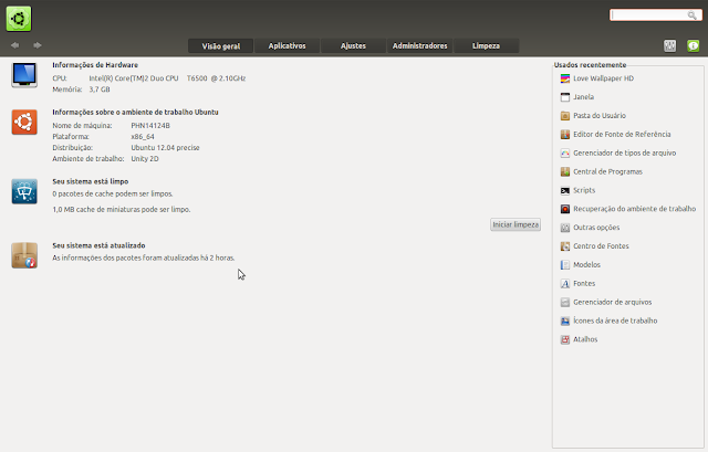 Abaixo vemos a tela inicial onde é possível ver algumas informações do sistema e é possível acessar diretamente a área de limpeza de arquivos temporários, kernels antigos e cache dos navegadores.