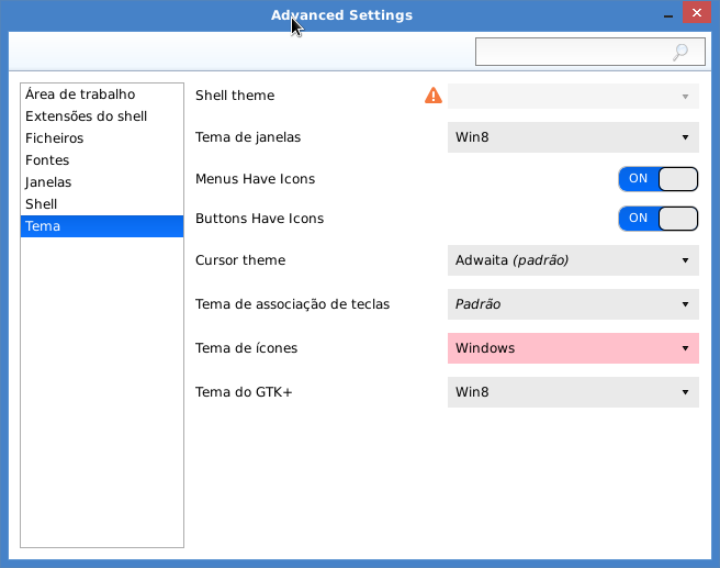 Modifique o tema de janelas, tema de ícones e tema gtk, deixando-os como na imagem acima.