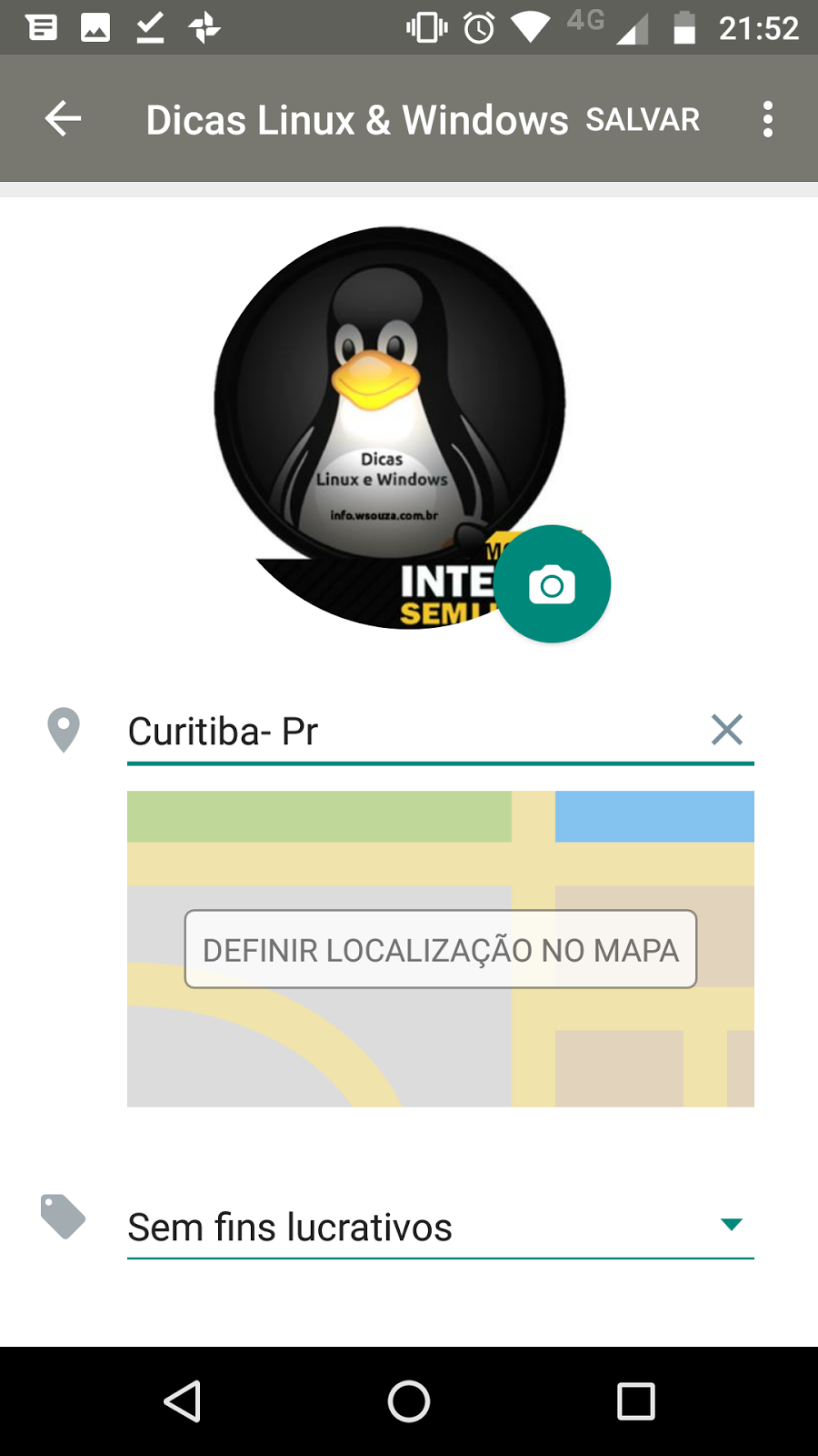 Agora vamos à configuração do perfil da empresa. Configure o nome que será mostrado para seus clientes. Tome cuidado, pois este nome não poderá ser alterado. A foto do perfil (logo) pode ser adicionada da mesma maneira que no aplicativo WhatsApp normal.