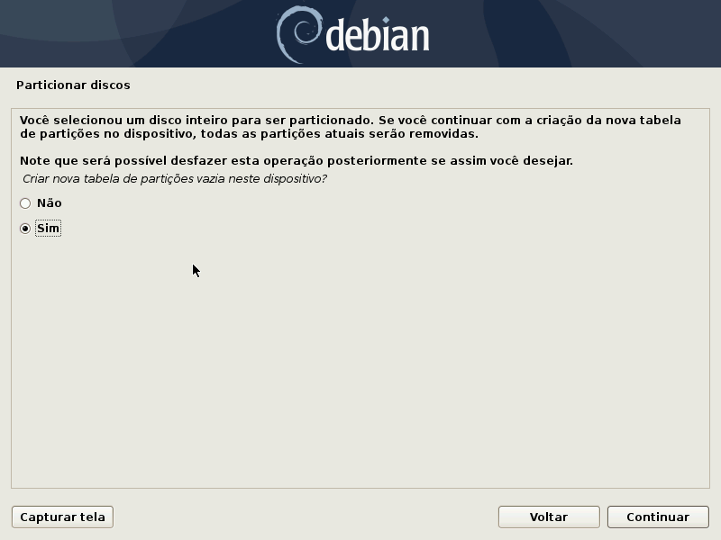 Como o disco principal (sda) já está vazio, o instalador pede para criar uma nova tabela de partições nele. Escolha sim e confirme.