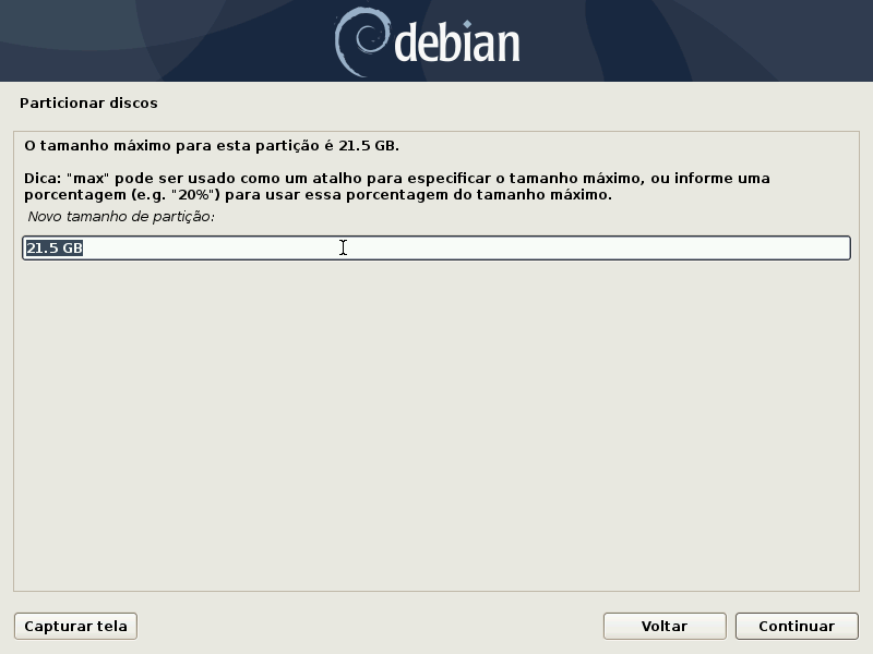 Neste caso escolhi o tamanho máximo porque tenho mais de 1 disco. Mas se tiver um único disco, um disco vazio, ou um disco maior, como sugestão pode deixar uns 30% para o sistema, 20% para a /home e 48% para outros dados ou instalação de um outro sistema operacional e 2% para a partição swap.
