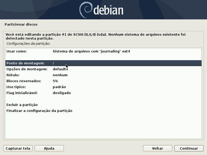 Escolhida a partição /sda chegou a hora de formatá-la e definir o ponto de montagem. Deixe como está na imagem abaixo e a partição estará formatada. Para modificar uma opção basta clicar em cima do nome_._ Após, escolha a opção Finalizar a configuração da partição.