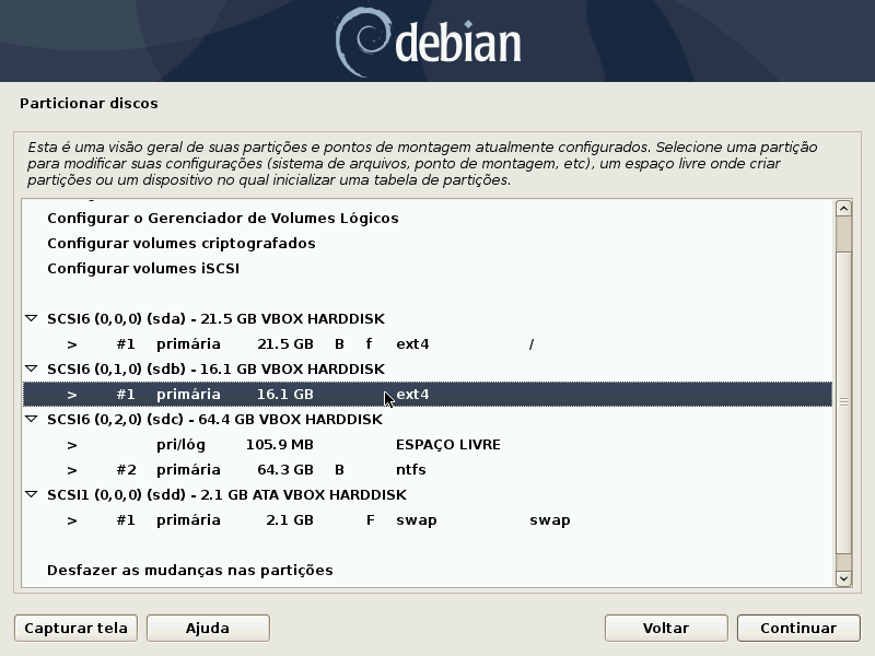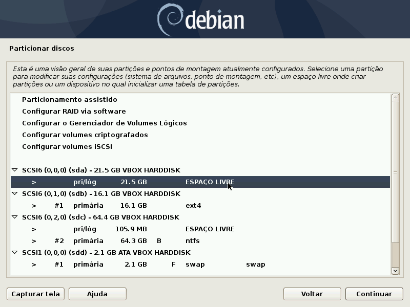 Na tela abaixo aparecem 3 discos, sendo que o sdc (de 64.3 Gb) possui 2 partições. Neste disco há o Windows 7 instalado, ótimo para mostrarmos uma instalação em Dual Boot. O disco sdd (2.1 Gb) é uma partição utilizada para troca de arquivos, conhecida como swap. Como ela já está formatada não é preciso mexer nela. Vamos instalar o Buster no primeiro disco, chamado de sda (21.5 Gb) e vamos separar os arquivos do usuário /home, no disco sdb (16.1 GB). Nos próximos passos comentarei mais a respeito desta separação e para mais detalhes sobre as partições veja as notas no final da matéria.