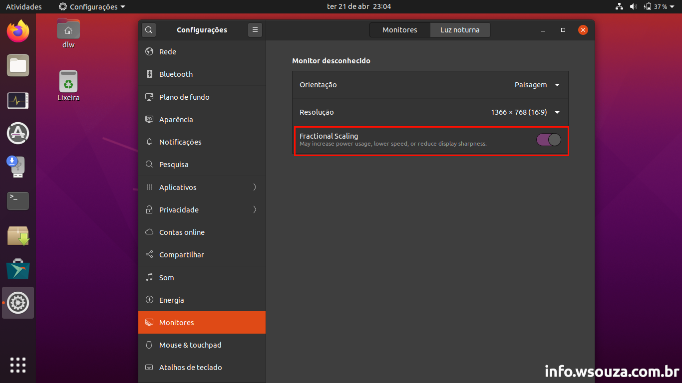 - Botão de ativação da escala fracionária na tela de configuração do monitor. Tal configuração permite alterar “Zoons” diferentes para cada monitor (quando utilizado mais de um monitor, obviamente);