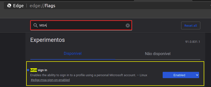 - Depois, deixe a opção MSA Sign in como mostrado na imagem abaixo, marcado como “Enabled” (marcado em amarelo). (Por padrão ela vem como Default);